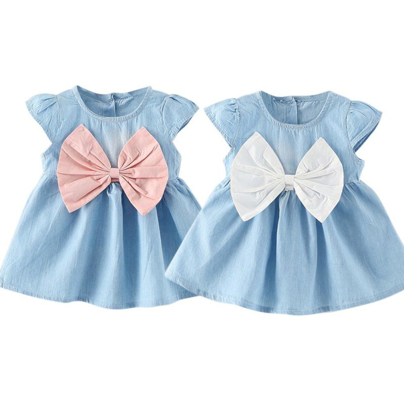 Cute Baby Girls Children Kids Bow-knot Design Denim Baby Summer Style Casual Wear Short Sleeve Mini Dress Clothes