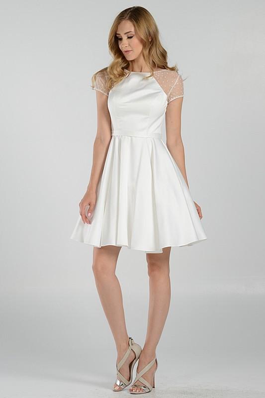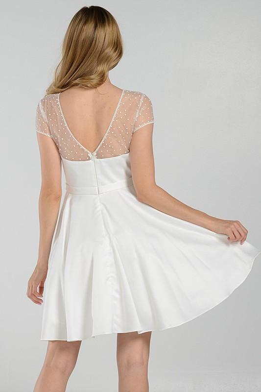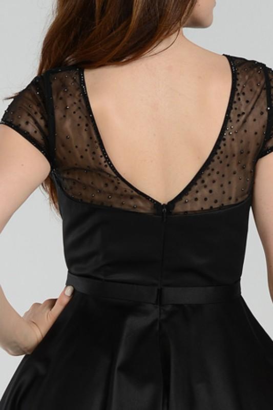 Wow in this Timeless elegant cap sleeve black homecoming dress. A chic and flirtatios formal dress adorned with sparkling beaing throughout its sheer cap sleeve. This inexpensive black homecoming dress features a simple satin bodice accented with a thin belt at the waist and finish with a fun and flirty flare satin skirt.