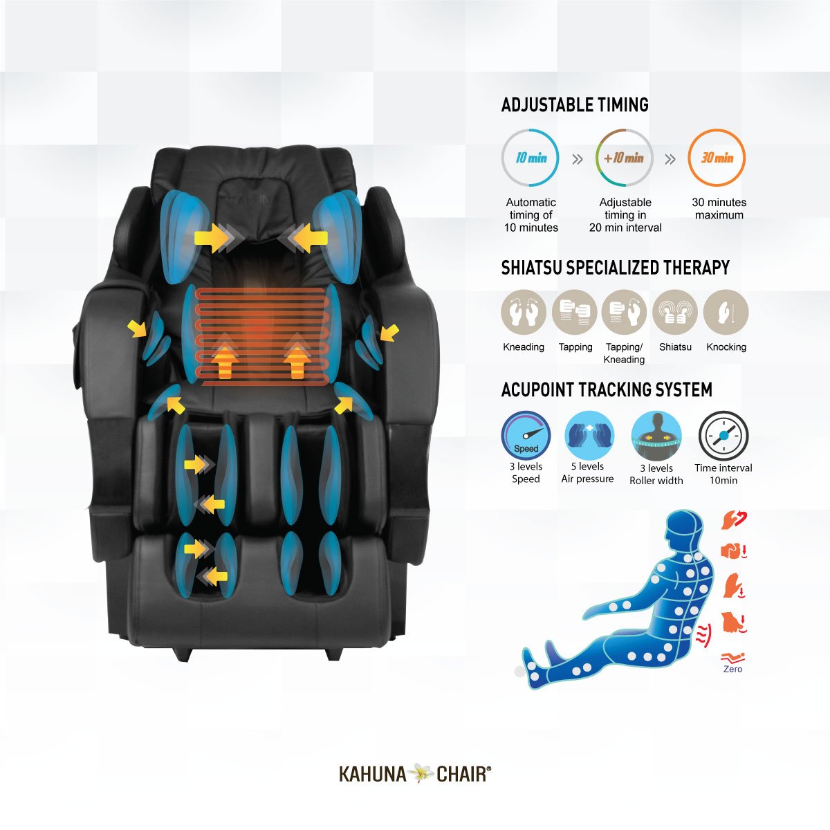 - Our Kahuna chairs come with standard 5 Auto programs, now we have added 4 special programs. Making our first chair to have a total of 9 Auto programs allowing you to choose from a different variety and style of massage programs that target specific areas.