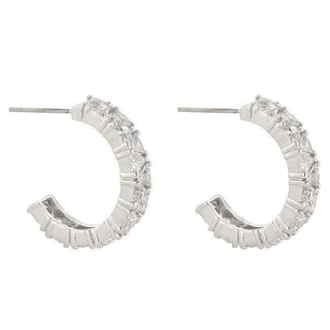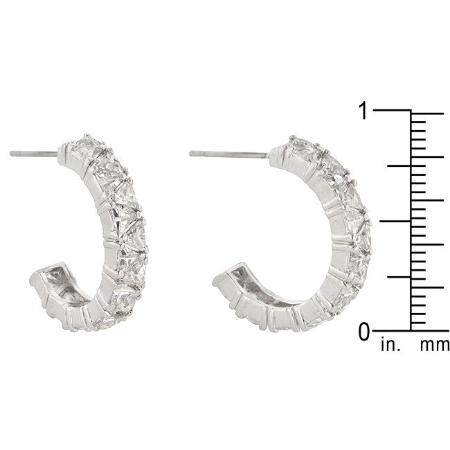 Clear trillion cut stones line the shape of these hoop earrings lending a feel of class and glamour. Our genuine rhodium finish is achieved using an electroplating process that coats the item with heavy layers of rhodium a close cousin to platinum which gives our jewelry a platinum luster.