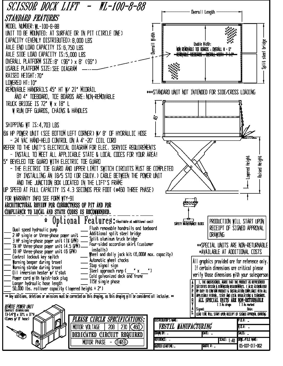 Save time and reduce man-hours where there are no docks with a Truck Scissor Dock Lift. The pit or surface mount has an optional approach ramp. Engineered and designed for maximum safety and efficiency. The checkered plate deck is made of heavy gauge steel of use. Hydraulic cylinders feature emergency velocity fuse if line breaks. It comes complete with upper travel limit switch and overload relief valve. The push-button control is on a long coil cord. Pre-wired control box includes magnetic starter and overload fuse. High visibility safety yellow removable handrails with fixed toe boards are standard. Includes beveled toe-guards and electric toe-guards around perimeter of platform. The external motor can be located up to eight (8) feet away from lift.