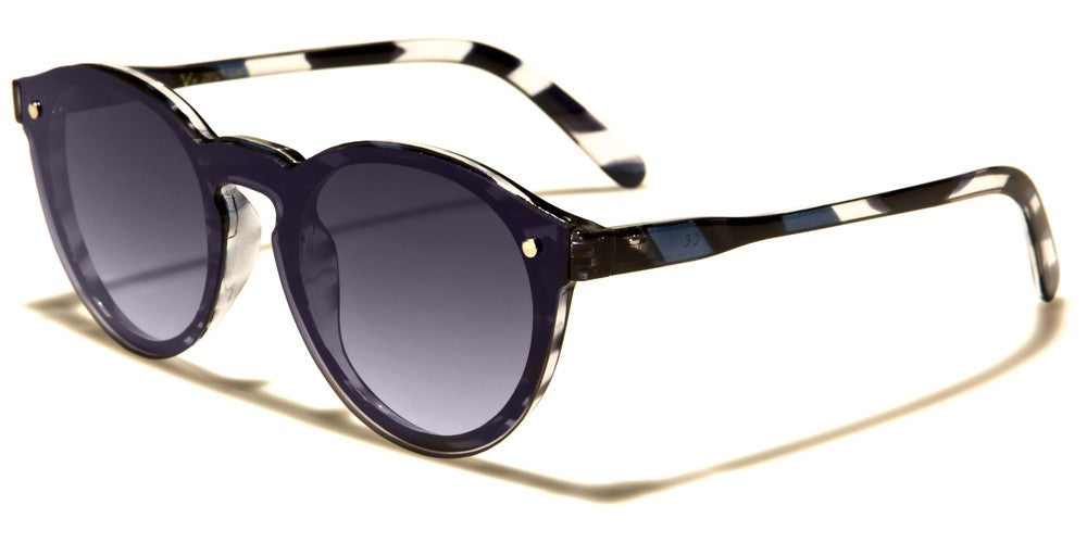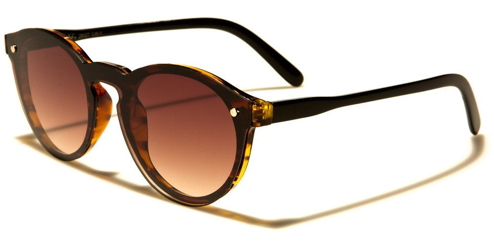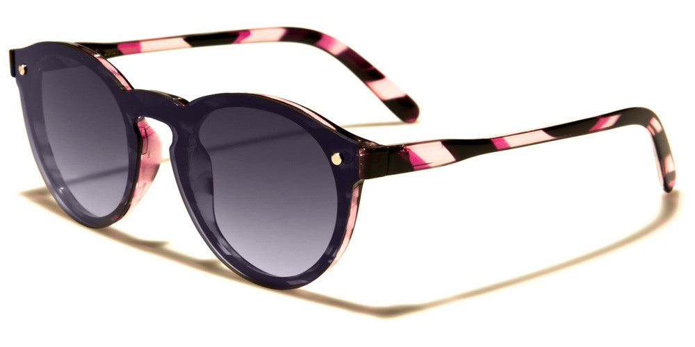 These cute sunnies combine round lenses with stylized wayfarer frames for a look that is delicate, even if some of the color combinations are anything but shy. Round plastic frames include a molded bridge and molded nose pads. A bright metallic accent is located near the inner edge of the cat eye flares at the outer corners. Slender arms narrow slightly to extend back into long, curved earpieces. Three of the five color options include striped bands of color along the arms. Your order will include a selection of all five color options available in this style. These sunglasses are sold in bulk by the dozen.