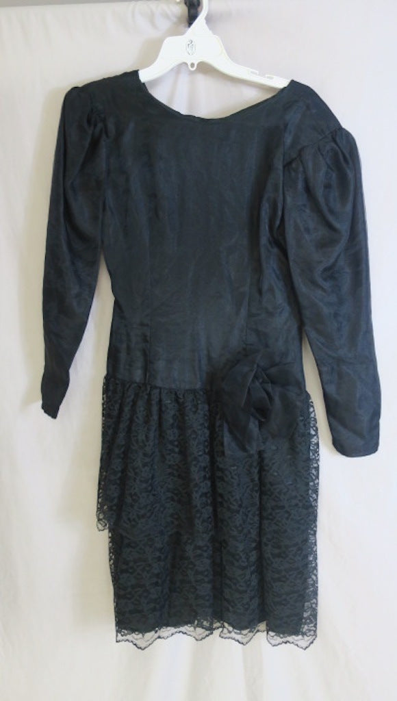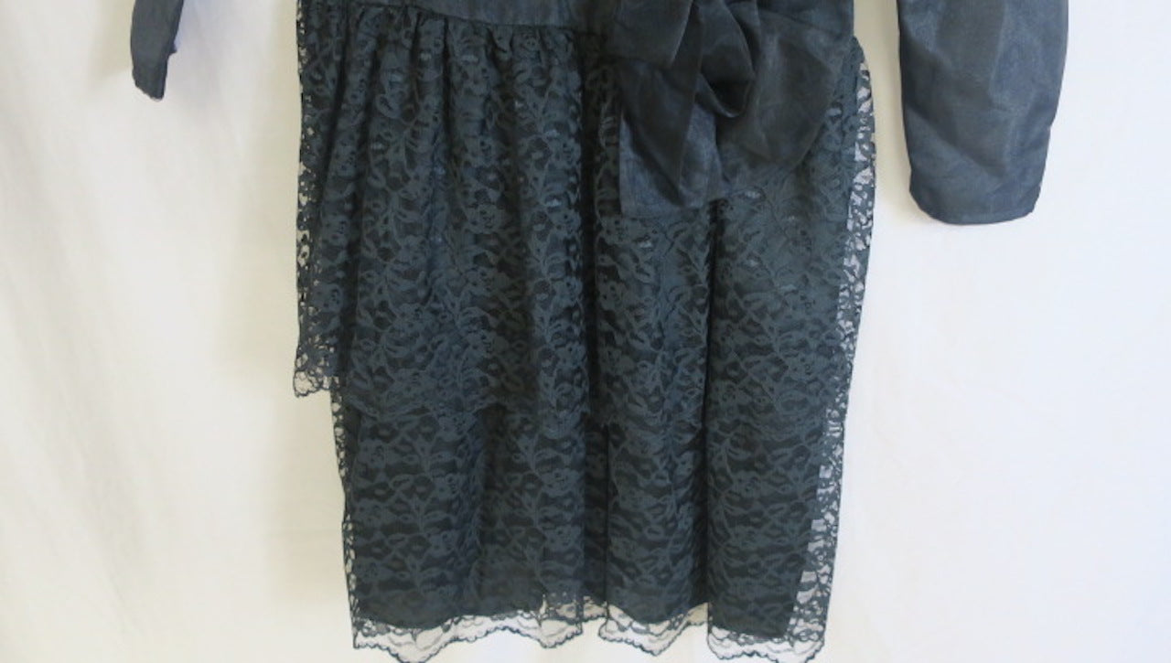 Vintage Black longsleeve 80's cocktail prom dress with layered lace skirt, rosette accent