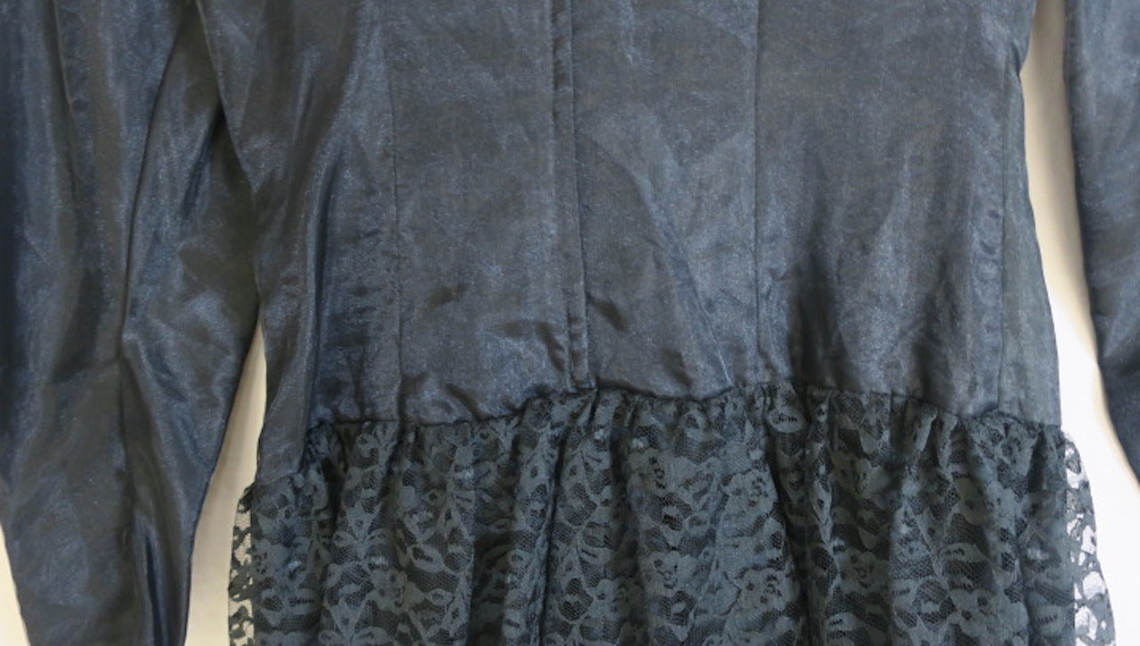 Vintage Black longsleeve 80's cocktail prom dress with layered lace skirt, rosette accent. This vintage piece comes from a vintage store in upstate New York. The store closed and the inventory can be yours anywhere in the world! Measurements are listed when possible. If not, please ask and we will get back to you ASAP. This collection is stored away from my homebase, a 4 day handling time is listed, though it’s very possible it can ship within 24 hours. Please alert me if you need this item quickly! Each piece is final sale due to the unique nature of the garments, so be sure to ask anything you are unsure about.