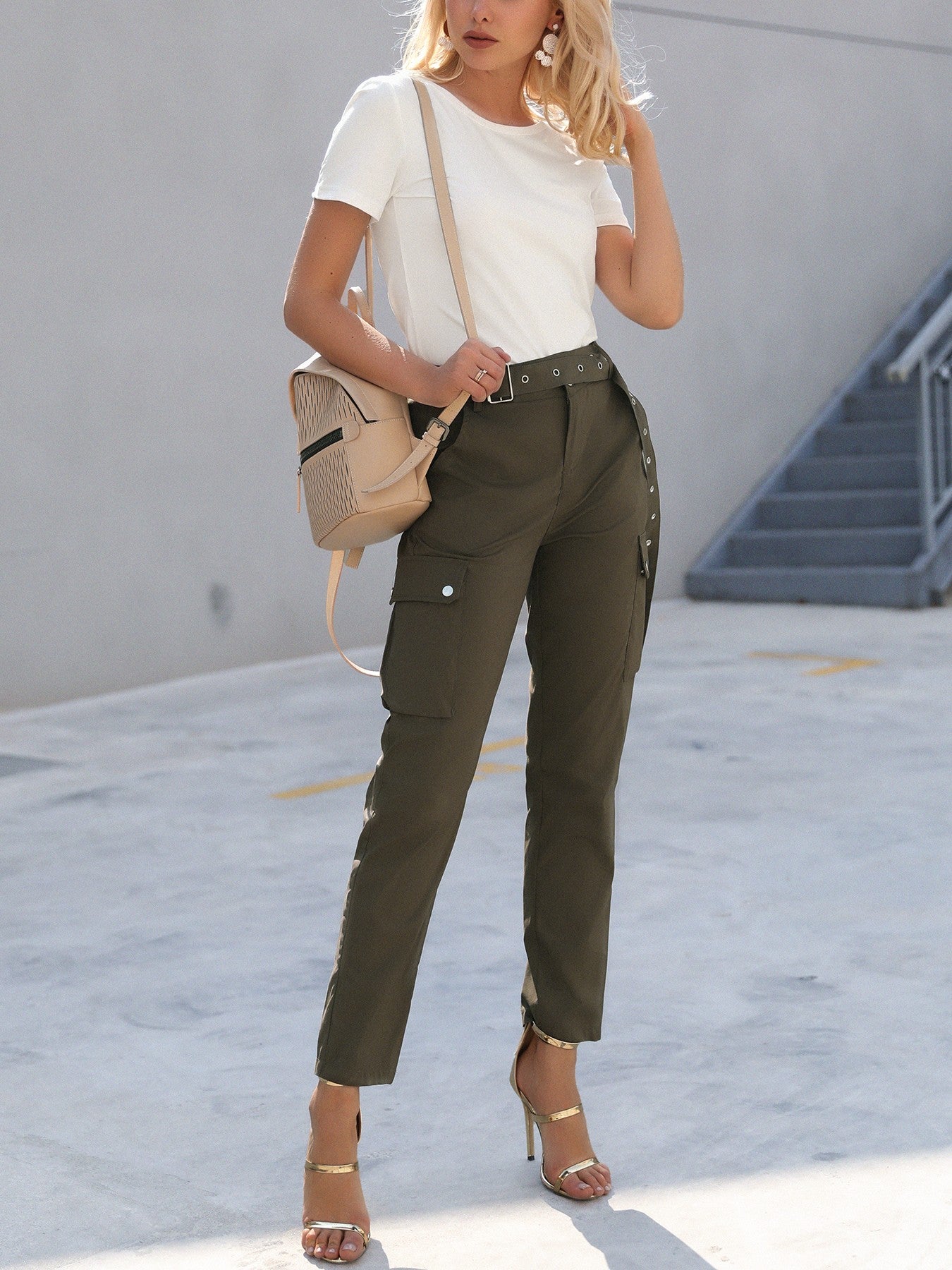 Waist Belted Eyelet Pocket Design Leisure Pants