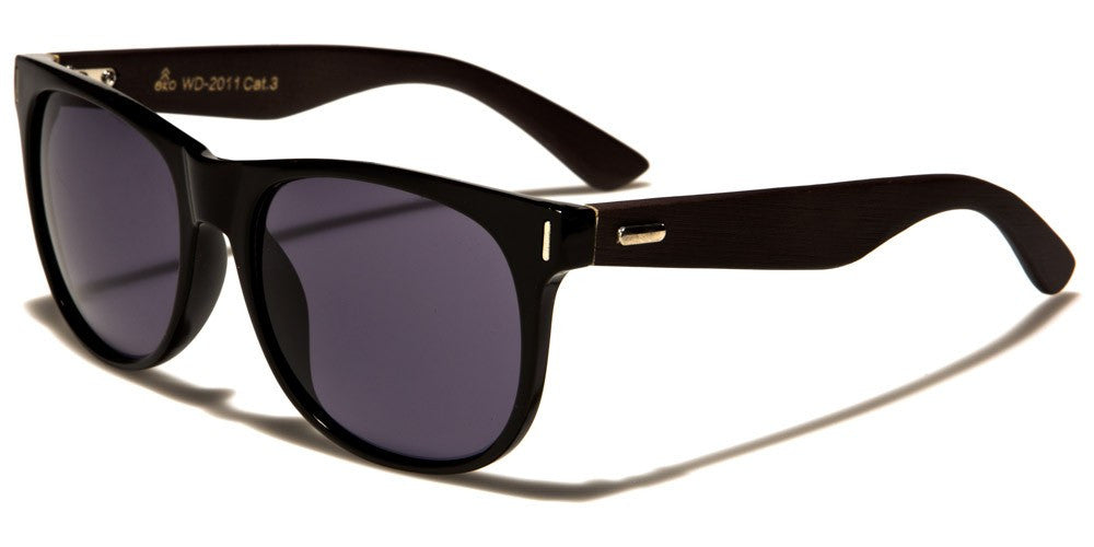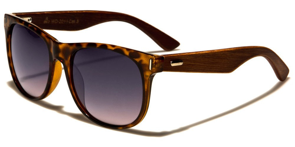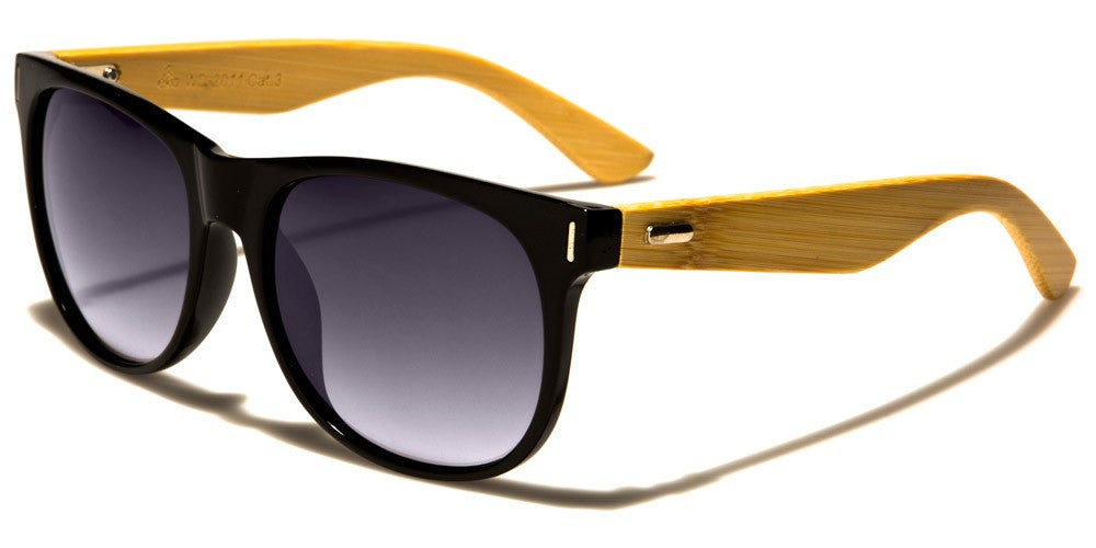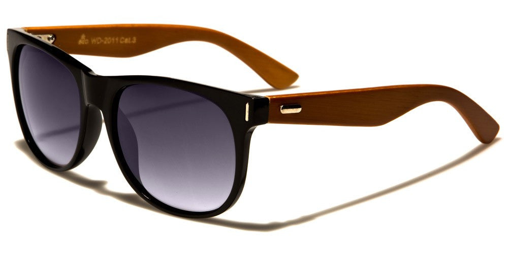 These wayfarer sunglasses for men and women are made of plastic and wood. They offer UV400 protection, which gives people greater peace of mind when wearing these modern-day sunglasses. Plastic frames come in black and tortoise brown; lenses come in smoke, gradient smoke and amber smoke; wooden arms come in dark brown, orange, beige and gray. The glasses are sold in bulk in boxes of 12 pairs.