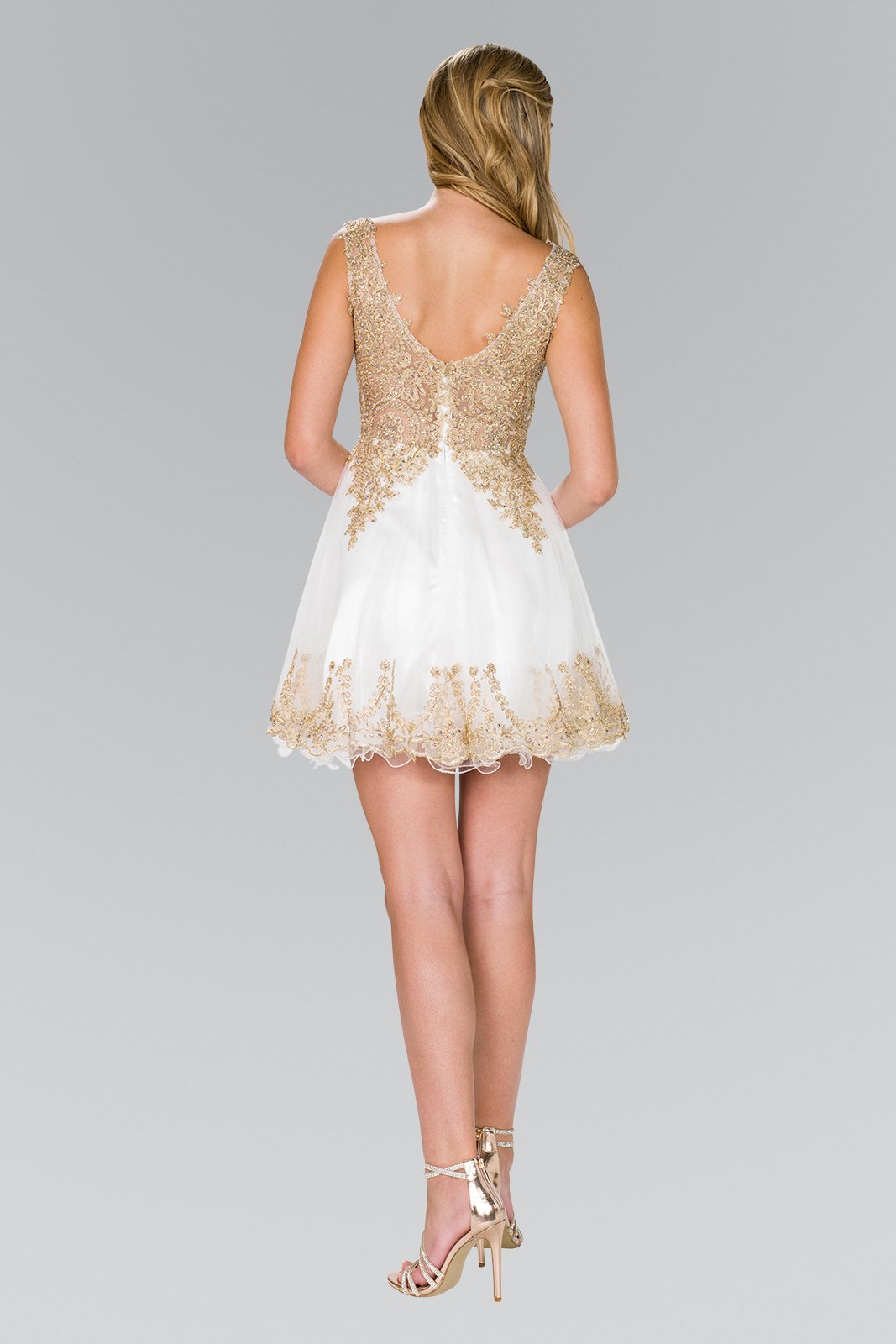 Dress like a true fashionista this homecoming season with this glamorous and trendy white gold embroidered bodice short homecoming dress. A sleeveless v cut neckline sparkling beaded bodice short formal dress with a v cut back. This beautiful inexpensive homecoming dress also features a soft light weight fun and flirty tulle skirt.
