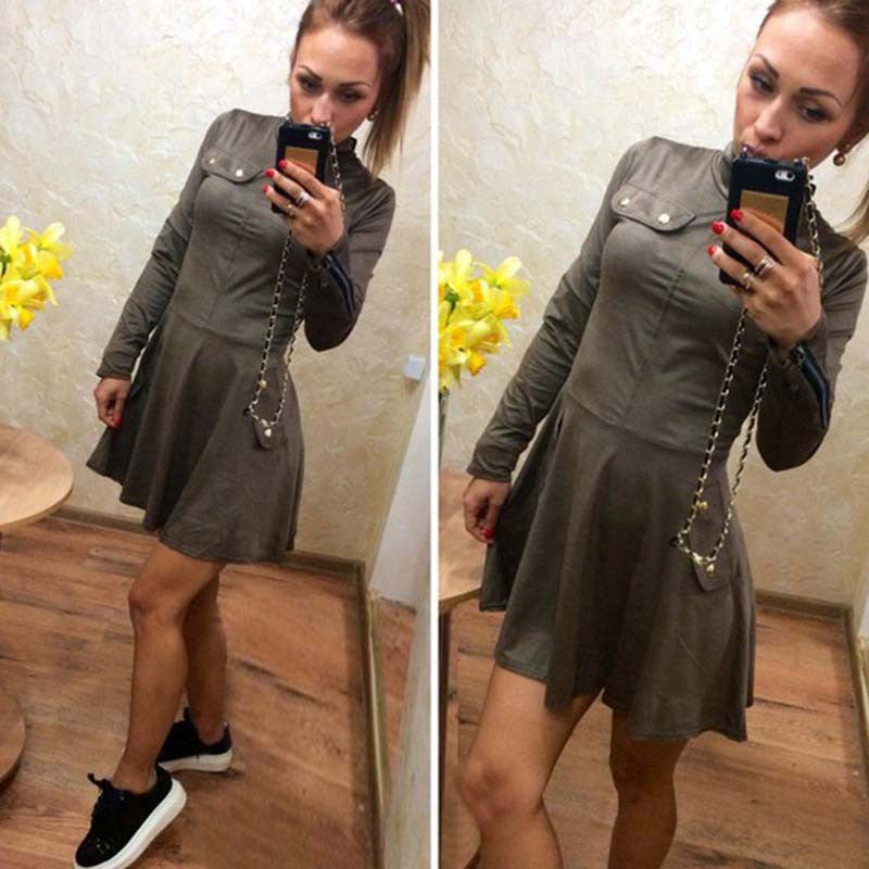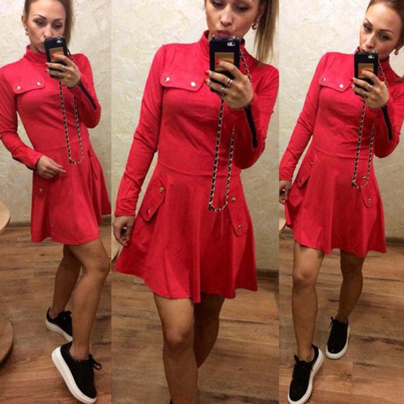 Women summer new preppy style fit and flare solid full regular sleeve natural waistline turtleneck above knee mini dress