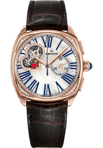 37mm x 37mm 18K rose gold case, transparent sapphire glass back, with set with 28 VVS brilliant-cut diamonds sapphire set crown, white mother of pearl dial with 35 VVS brilliant-cut diamonds around opening showing the heart of the El Primero movement, automatic El Primero 4062 movement with hours and minutes, heart-shaped small seconds display with heart-tipped hand, central chronograph hand, 30-minute counter at 2 o'clock, approximately 50 hours of power reserve, rubber lined brown alligator leather strap with gold folding buckle. Water resistant to 3 ATM.